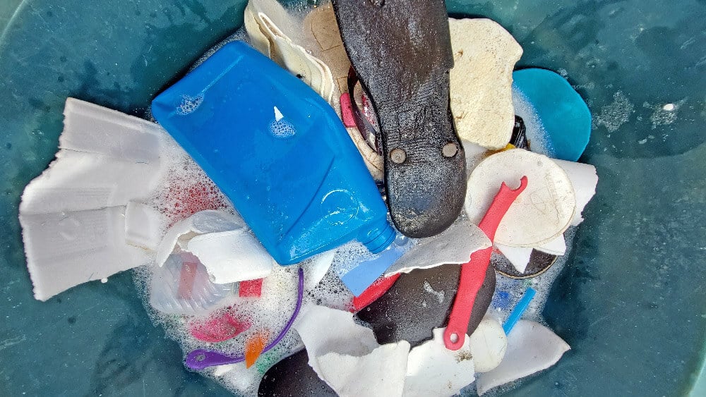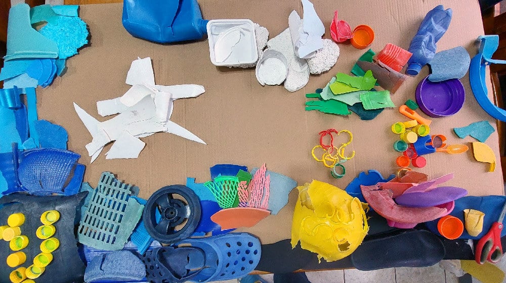 After the beach cleanup, marine litter of various colors and shapes were selected. These objects were washed and disinfected the following day and left to dry in the sun. Later an artistic composition was made that spread through the shape and colors of the found objects