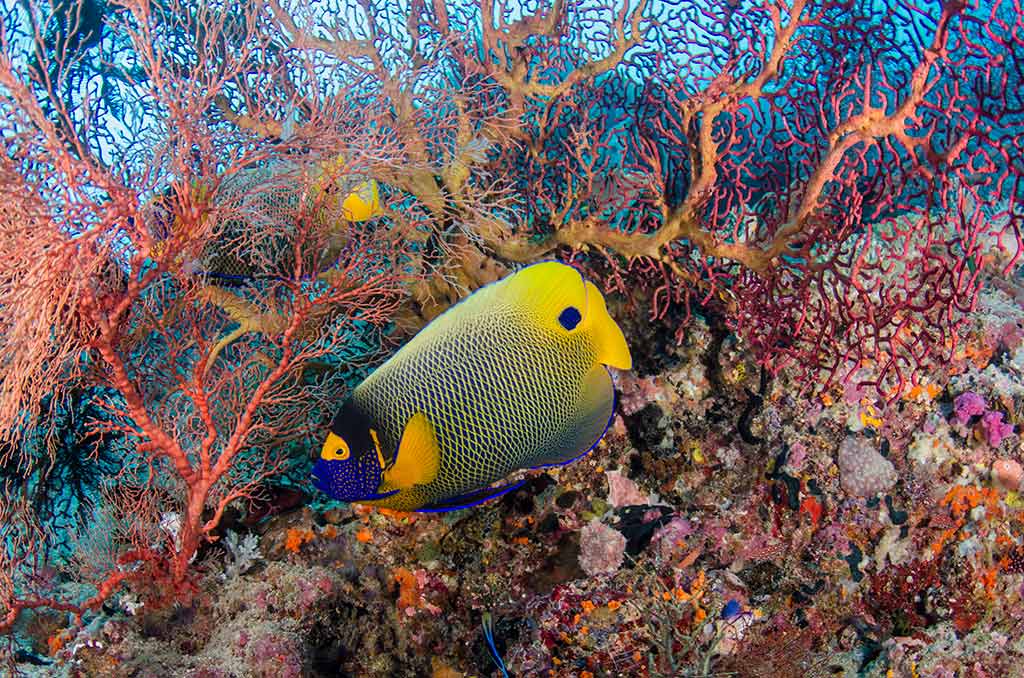 The waters around the Cannibal Rock pinnacle are alive with schooling fish, while the surrounding coral slopes offer plenty of opportunities to spot small reef creatures and colorful critters. Torpedo Alley features black sand slopes and vibrant reef areas, perfect for discovering tiny marine life among the corals. Yellow Wall is a stunning vertical reef adorned with golden soft corals and crinoids, creating a dramatic underwater backdrop.