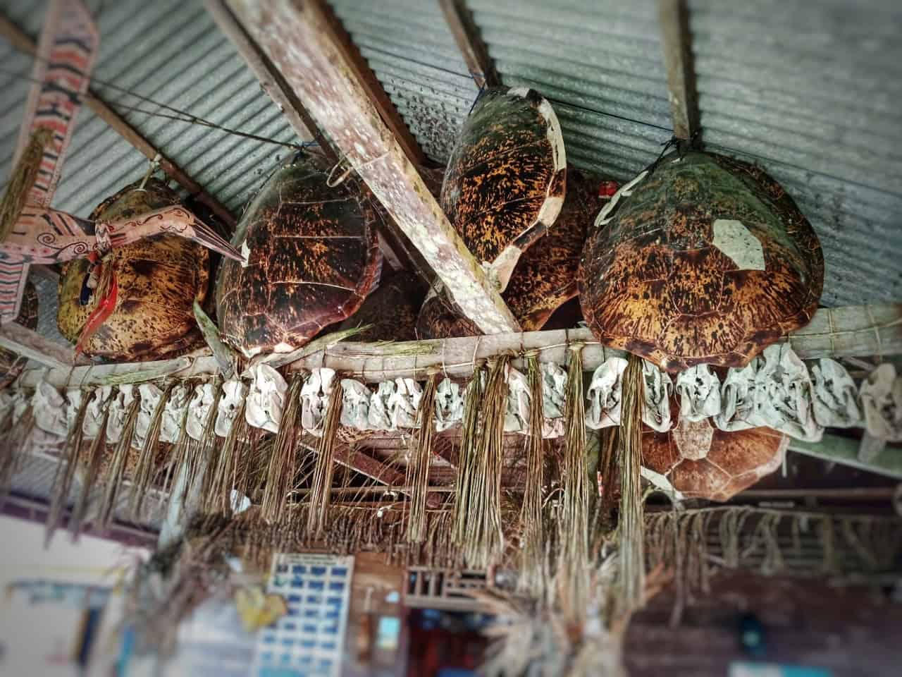 Sea turtle carapaces and skulls displayed as traditional decoration on a tribal house. Photo by Adela Hemelikova.