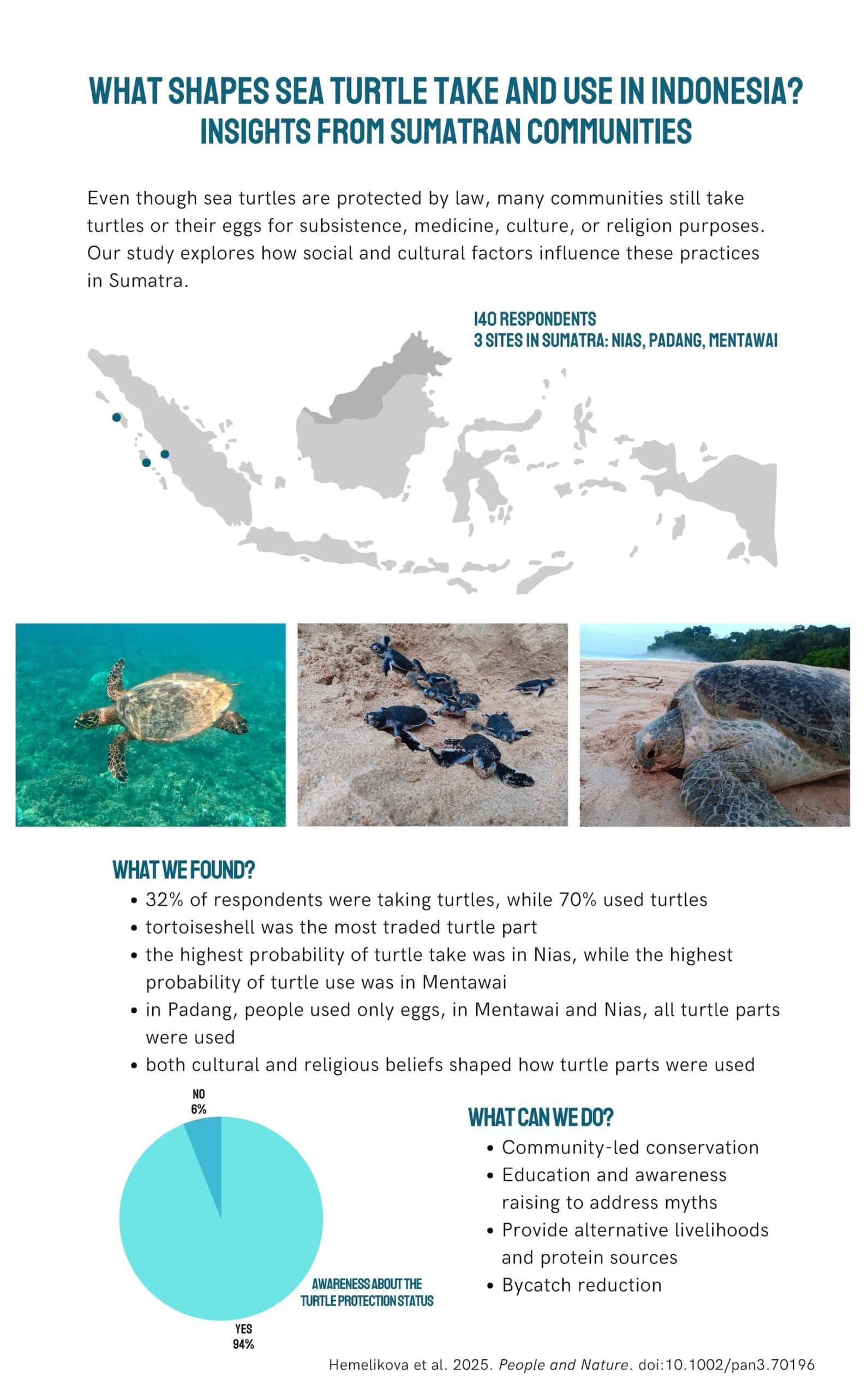 The research team interviewed 140 people across three sites in Sumatra, including Padang, Mentawai, and Nias. Participants were asked about their education, livelihoods, and belief systems, as well as whether and how they partake in turtle use and consumption.