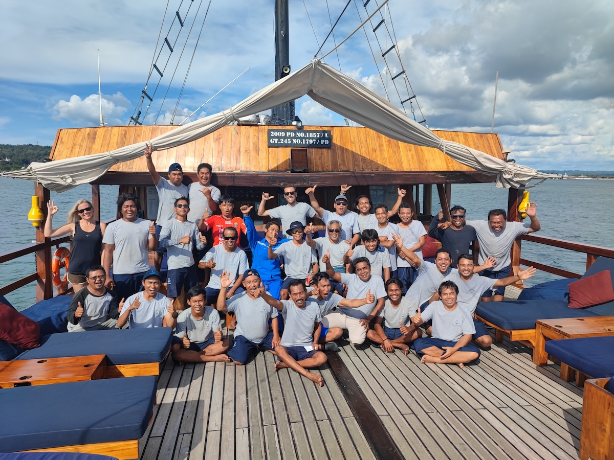 The Damai liveaboard crew smiles for a group photo as they sail through the stunning waters of Raja Ampat on an Oceanic Society expedition.