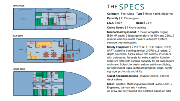 The Cachalote Explorer is a classic expedition-style yacht built for adventure and exploration throughout the Galápagos Islands. Originally constructed in Vancouver, Canada, for the rough North Pacific waters, its sturdy steel hull provides exceptional stability, ideal for navigating the archipelago in comfort. Accommodating just 16 guests in eight air-conditioned cabins with private bathrooms, the yacht offers a relaxed, small-group atmosphere with personalized service. Guests can unwind in the panoramic salon, dine together after a day of exploration, or take in the views from the spacious sun decks. With expert naturalist guides and thoughtfully designed itineraries, the Cachalote Explorer delivers an authentic Galápagos experience, combining close wildlife encounters, active excursions, and the charm of a small expedition vessel.