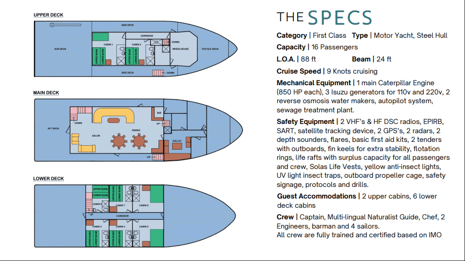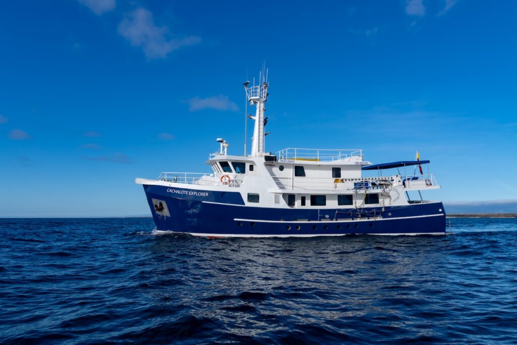 The Cachalote Explorer is a classic expedition-style yacht built for adventure and exploration throughout the Galápagos Islands. Originally constructed in Vancouver, Canada, for the rough North Pacific waters, its sturdy steel hull provides exceptional stability, ideal for navigating the archipelago in comfort. Accommodating just 16 guests in eight air-conditioned cabins with private bathrooms, the yacht offers a relaxed, small-group atmosphere with personalized service. Guests can unwind in the panoramic salon, dine together after a day of exploration, or take in the views from the spacious sun decks. With expert naturalist guides and thoughtfully designed itineraries, the Cachalote Explorer delivers an authentic Galápagos experience, combining close wildlife encounters, active excursions, and the charm of a small expedition vessel.