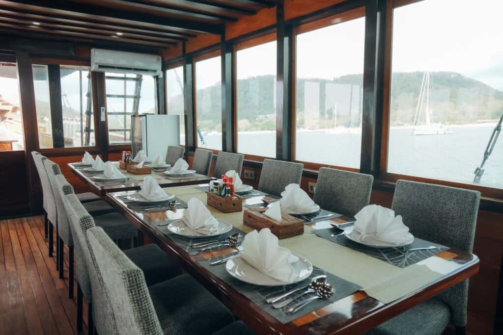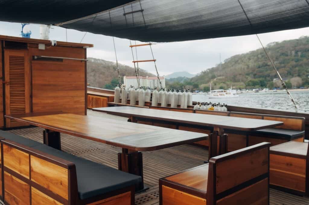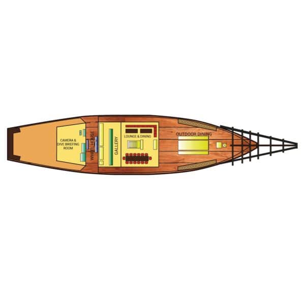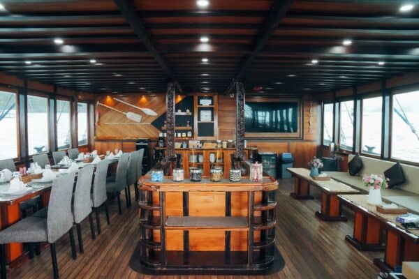 The indoor saloon is air-conditioned and furnished for leisure between dives. It includes a dining room where meals are served and a lounge with flat-screen TV and home cinema surround sound. Guests have access to snacks, tea, coffee, and soft drinks throughout the day.