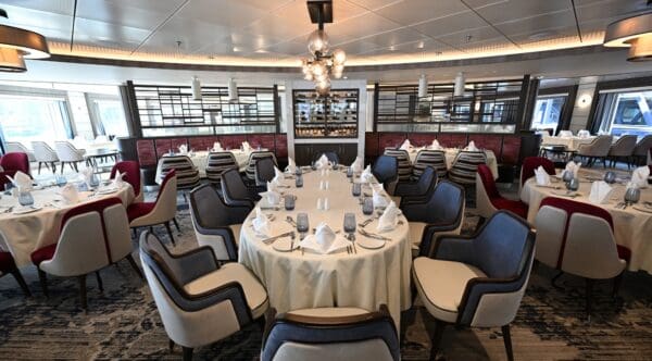 Dining Options: With two restaurants and two bars, meals are served with open seating to foster conversation among travellers. House wines, beers, and soft drinks are typically included with dinner, and tea or coffee and snacks are available 24/7.